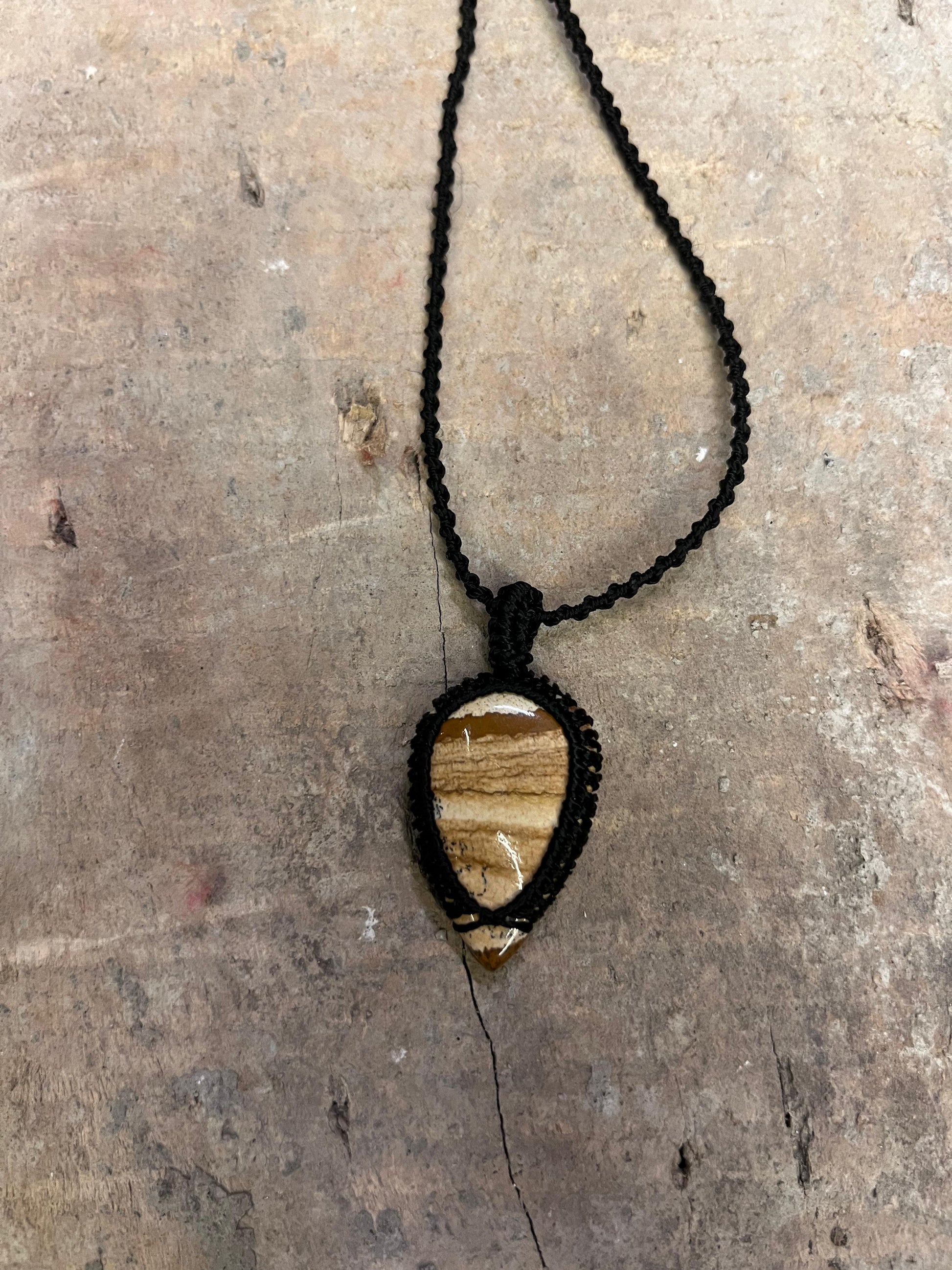 Rooted in simplicity and nature, this handcrafted pendant features a raw or polished natural stone suspended on a handwoven macramé cord. Free from metal or wire, the stone is secured purely through intricate knotwork, allowing its natural beauty and energy to shine through untouched.